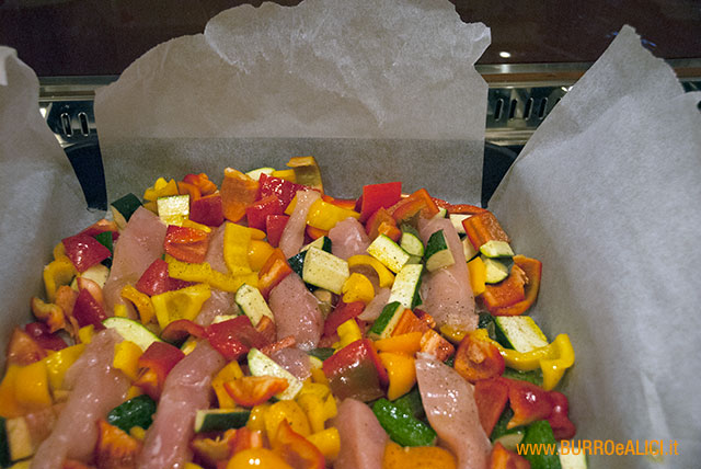 Nel tegame (io ne ho uno grande quadrato, da forno) disponete due pezzi di carta da forno incrociati come nella foto, versate le verdure già condite e disponete i petti di pollo (ogni petto tagliato a metà per lungo e condito prima con sale, olio e pepe) in modo che le verdure circondino ogni pezzo. Io non ho messo aglio e non ho messo erbe varie, ma potrebbero starci bene. Ripiegate i quattro lembi della carta forno e chiudete il tutto con un terzo pezzo, che infilerete sotto, come se doveste rimboccare un lenzuolo.